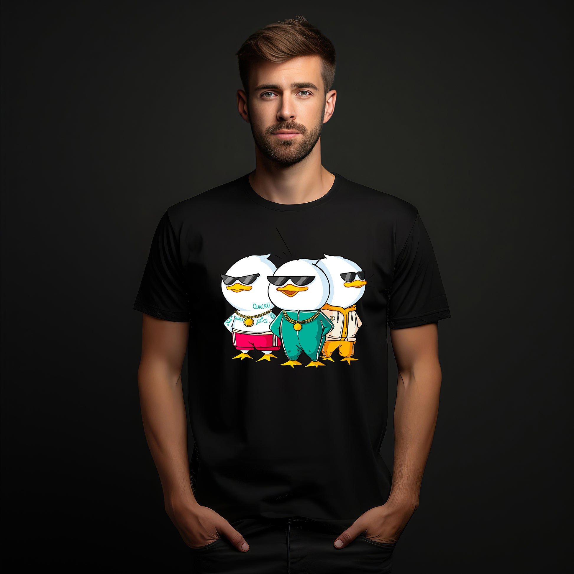 Drip too strong? It’s the QUACKU Street Squad. These crypto ducks roll deep in gold chains, shades, and swagger. This t-shirt blends meme culture with streetwear vibes, perfect for anyone who lives for the pump, the flex, and the flock. Rock it loud, rep it proud – QUACKU is the gang now.